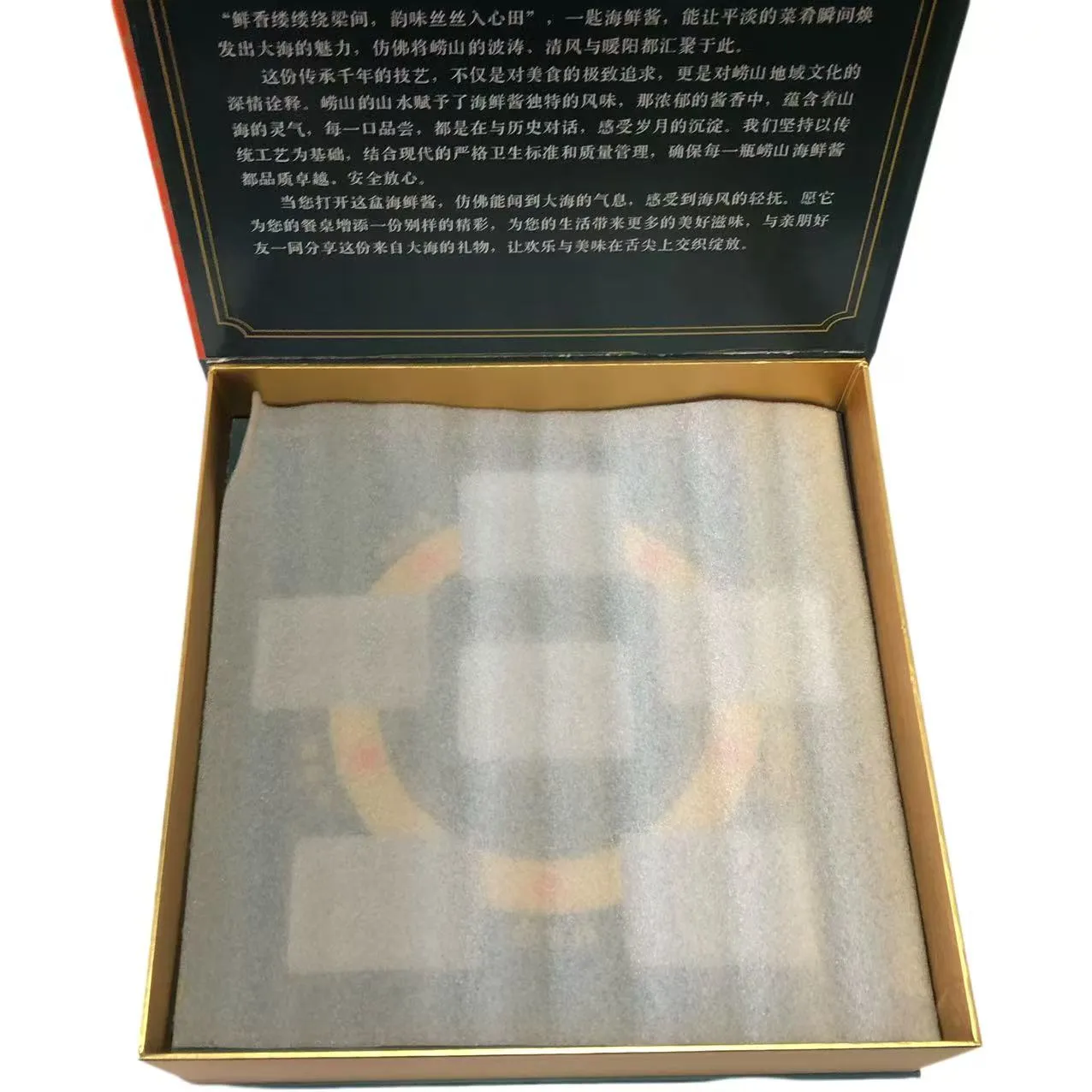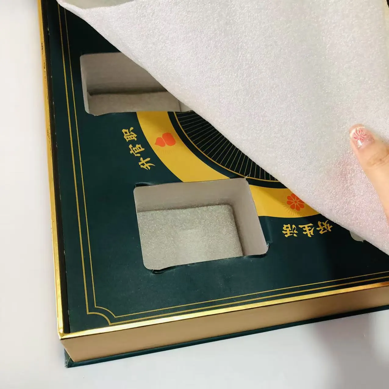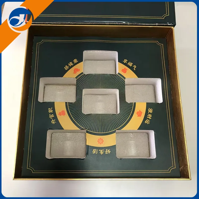 Lahjalaatikon sisällä on räätälöity sienivuori, joka voi saavuttaa iskunvaimennus- ja puskurointivaikutuksia peittäessäsi laatikon sisäpuolen. Laatikon sisällä on kuusi lokeroa, ja lokerot sopivat täydellisesti pullon runkoon.
